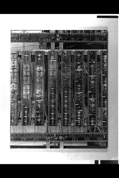 • Part of the transistor computer built by Dick Grimsdale and Douglas Webb at Manchester University, first demonstrated in November 1953. The computer was commercialised by Metropolitan Vickers as the Metrovic 950. The prototype employed 250 transistors and consumed around 150W.