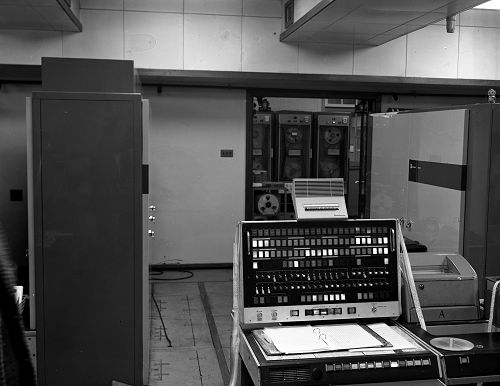 - This is the engineers console of the Manchester Atlas situated on the top floor of the Electrical engineering department in Dover street.The cabinet on the left contained the central control logic, the floating point arithmetic unit and the "B" store (120 index registers plus 8 special purpose registers). The right hand cabinet contained the "Fixed store" (read only) which consisted of small plastic "hairbrushes" with ferrite rods to read a "one" or a copper rod to read a zero. The unit can be further identified by the mascot known as the "Fixed Store Pig" standing on top of the cabinet. The Creed 75 printer to the right of the console was used to output data mainly when running test programs and laterly operator instructions from the "supervisor" operating system. The magnetic tape units in the room to the rear were Ampex FR300 and TM2 transports.(8 decks on this machine).The drum storage was also installed in this room along with the DC power sequencing unit. .