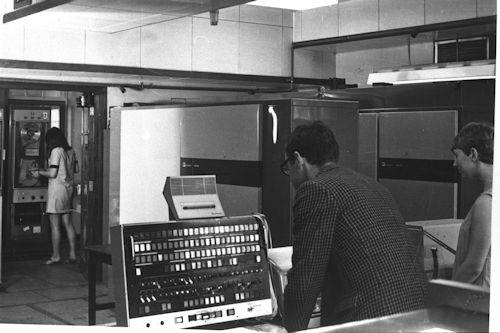 • The Manchester Atlas in use. Alan Davies at the control console, the fixed store behind the console, and Anita Payne at one of the Ampex tape decks. The fixed-store is in the cabinet to the right with the "fixed store pig" on the top. Similar to page15b but a slightly different angle and with people in it.